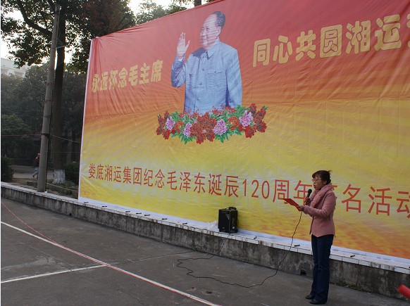 今年是毛澤東主席誕辰120周年,是公司深入學(xué)習(xí)貫徹黨的十八屆三中全會(huì)精神,踏上新征程的開局之年。12月24日上午9時(shí)許,公司在老機(jī)關(guān)院落籃球坪隆重舉行“永遠(yuǎn)懷念毛主席、同心共圓湘運(yùn)夢(mèng)”紀(jì)念毛澤東誕辰120周年離退休老同志大型簽名紀(jì)念活動(dòng),緬懷先烈們的豐功偉績(jī)。公司婁底片離退休、 內(nèi)退、協(xié)保同志近四百人參加了此次活動(dòng)。公司董事長(zhǎng)兼總經(jīng)理彭瑞華、監(jiān)事會(huì)主席吳一江等公司領(lǐng)導(dǎo)親臨活動(dòng)現(xiàn)場(chǎng)。