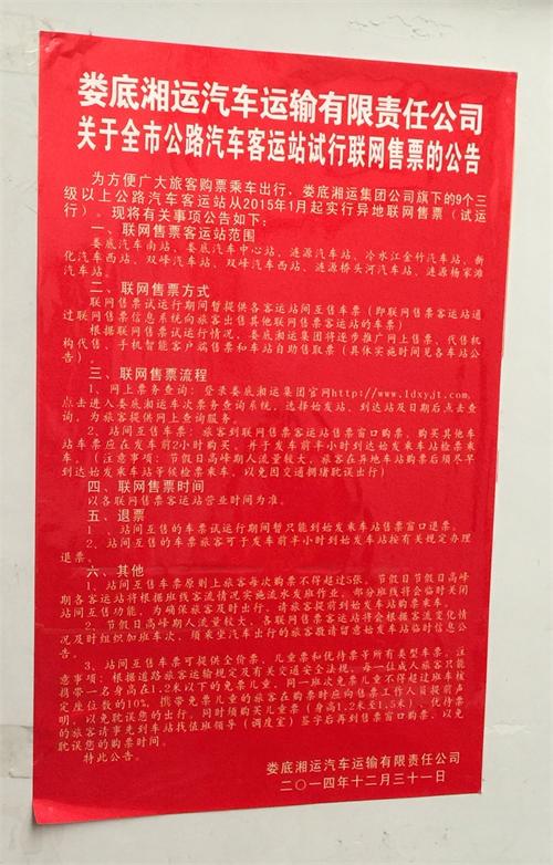 2015年春運將至,為方便市民購買回家車票,給廣大市民提供快捷、優(yōu)質(zhì)的出行服務(wù),婁底湘運公司創(chuàng)新客運售票服務(wù)方式。從元月8日開始,公司轄下的婁底汽車站、婁底汽車南站、新化汽車西站、冷水江金竹車站、雙峰汽車站、雙峰汽車西站、漣源汽車站、漣源橋頭河汽車站、漣源楊家灘汽車站九個客運汽車站全面實行聯(lián)網(wǎng)售票,旅客可就近在其中任意車站購買其他車站始發(fā)車票!