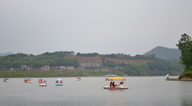 因先前聯(lián)系好了,山莊的王經(jīng)理早早就在等候我們,她把游玩的票發(fā)給大家。大家開始放飛了!有垂釣愛好者拿著早早準(zhǔn)備好的釣桿開始在河邊占地盤,喂魚食,裝蚯蚓,靜坐,大有一副姜太公釣魚之勢(shì)!不禁猜他們真正想做的不全是釣魚,而是一種心境!有的結(jié)伴沿著“湘軍橋”觀賞曾國(guó)藩、左宗棠筆墨,大聲朗誦詩(shī)詞,頗有文人風(fēng)范;有喜歡劃船的同事們來這尋找童年的步伐,三個(gè)一行,五個(gè)一伙,為安全起見,每個(gè)船上坐一位男同胞,漾著小船在河中嘻水,唱山歌;也有一些同事們爬山累了,就倚在河邊的竹亭里休息,微風(fēng)拂面,看白鴿群舞,觀孔雀開屏,拋開一切煩惱和壓力,享受著大自然的寧?kù)o和怡然,愜意!